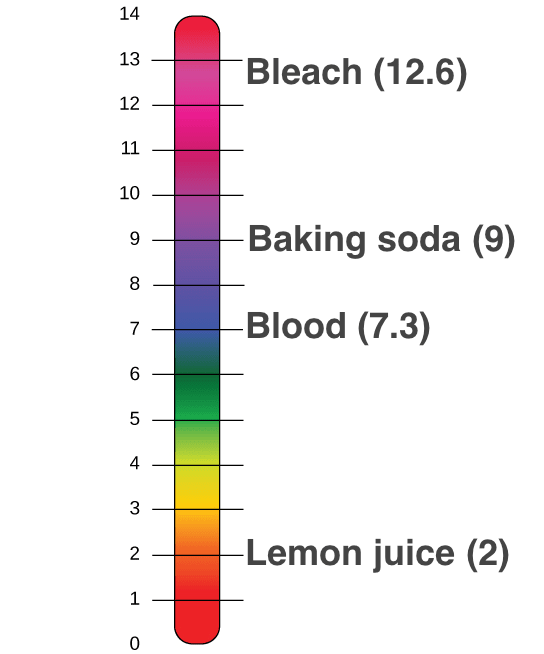 The pH scale goes from 0 to 14. 0 being the most acidic (think batteries) and 14 being the most alkaline, or basic (think drain cleaner). For those of us visual gals, see the chart below.